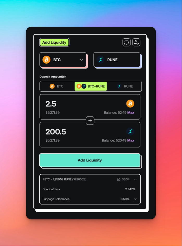 **Example**: If you deposit $10,000 worth of BTC, you also need to deposit $10,000 worth of RUNE.